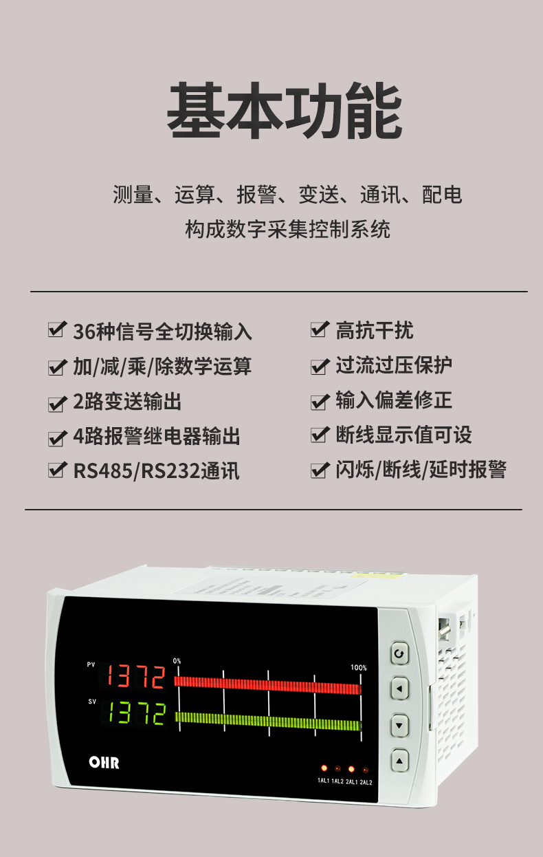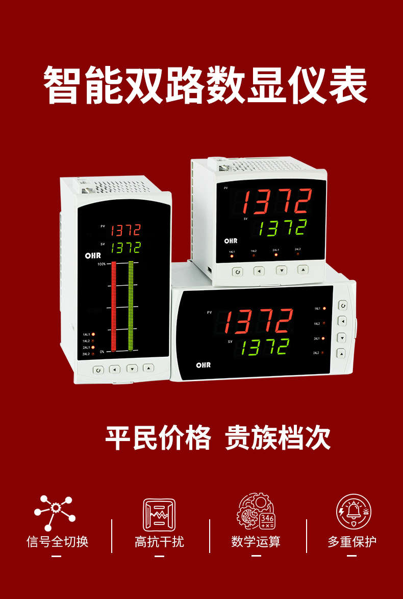 虹潤公司是專業(yè)生產數顯表的國家專精特新“小巨人”企業(yè),生產的智能雙路數顯儀表,具有全切換信號輸入,加減乘除數學運算,高抗干擾,過壓過流保護,RS485/RS232通訊等特點。產品獲得巡回檢測顯示方法及裝置、儀表殼體等2項國家發(fā)明專利,主持起草工業(yè)過程控制系統用模擬輸入兩位或多位輸出儀表、物聯網智能溫度儀表通用技術條件等2項國家標準,,以及通信系統多通道數據采集控制終端規(guī)范軍用標準,參與國際5G標準制定,取得雙回路數字顯示控制儀表等3項相關軟件著作權。產品廣泛應用于電力、石化、冶金、化工、造紙、食品、輕工、制藥、熱處理、水處理、機械配套等各種工業(yè)現場。