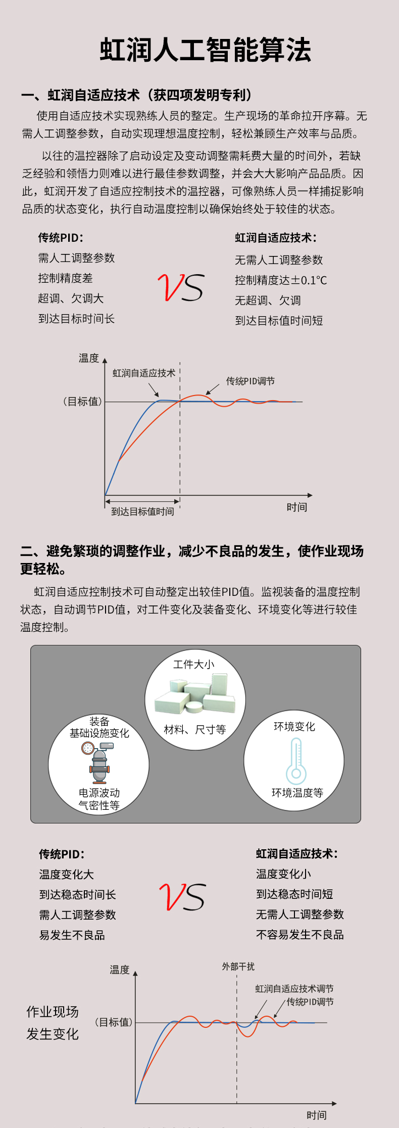 虹潤公司是專業生產溫控器的國家專精特新“小巨人”企業。生產的人工智能溫控器,具有真正人工智能算式,無需人工整定參數,控制精度可達±0.1°C,多種輸出類型,高抗干擾等特點。產品獲得模糊PID控制儀及控制方法、人工智能調節器、智能化控制器、移相觸發控制器、閥門自動手動無擾動操作控制方法及裝置等5項國家發明專利,主持起草工業過程控制系統用模擬輸入兩位或多位輸出儀表、物聯網智能溫度儀表通用技術條件、工業過程測量和控制系統用智能調節器等3項國家標準,以及通信系統多通道數據采集控制終端規范軍用標準,參與國際5G標準制定,取得模糊PID溫控儀等3項相關軟件著作權。產品廣泛應用于電力、石化,冶金、制藥、食品等幾乎所有工業現場,實現精準控溫,保障生產安全與質量。