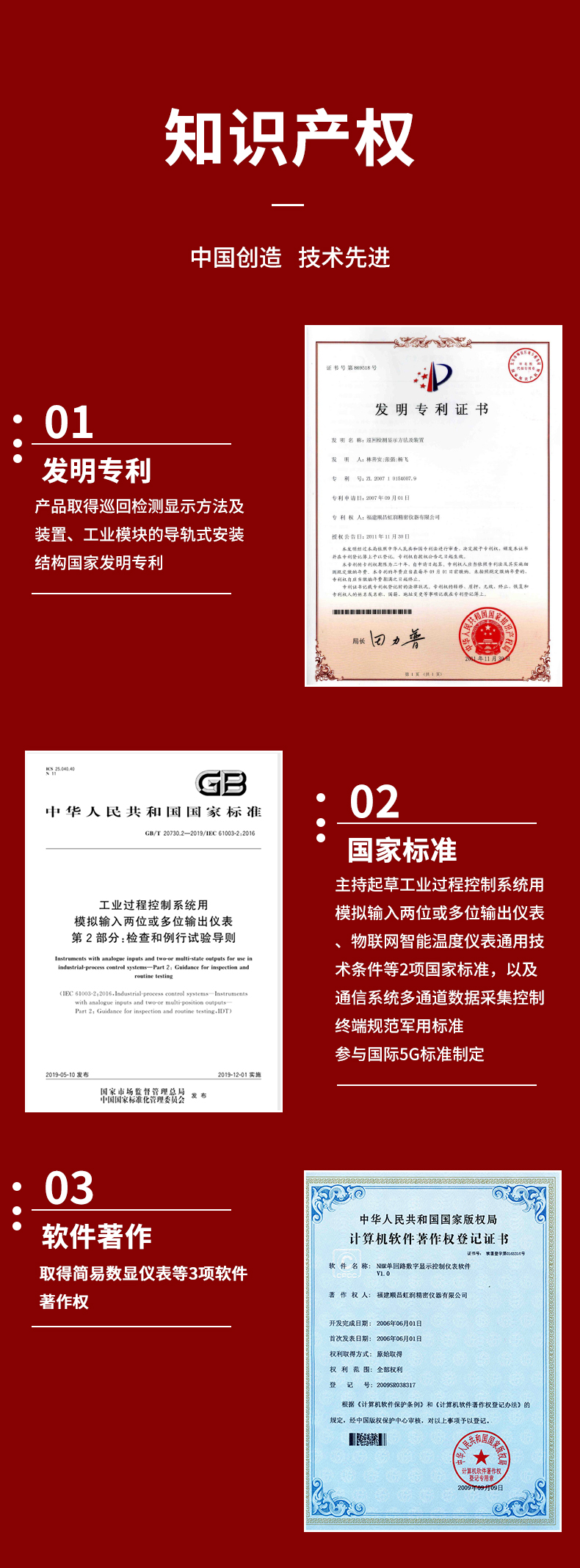 虹潤公司是專業生產數顯表的國家專精特新“小巨人”企業,生產的導軌式數顯儀表,具有全切換信號輸入,導軌壁掛共用,全隔離設計,高抗干擾,變送輸出或RS485通訊等特點。產品獲得巡回檢測顯示方法及裝置、工業模塊的導軌式安裝結構等2項國家發明專利,主持起草工業過程控制系統用模擬輸入兩位或多位輸出儀表、物聯網智能溫度儀表通用技術條件等2項國家標準,,以及通信系統多通道數據采集控制終端規范軍用標準,參與國際5G標準制定,取得簡易數顯儀表等3項相關軟件著作權。產品廣泛應用于電力、石化、冶金、化工、造紙、食品、輕工、制藥、熱處理、水處理、機械配套等各種工業現場。