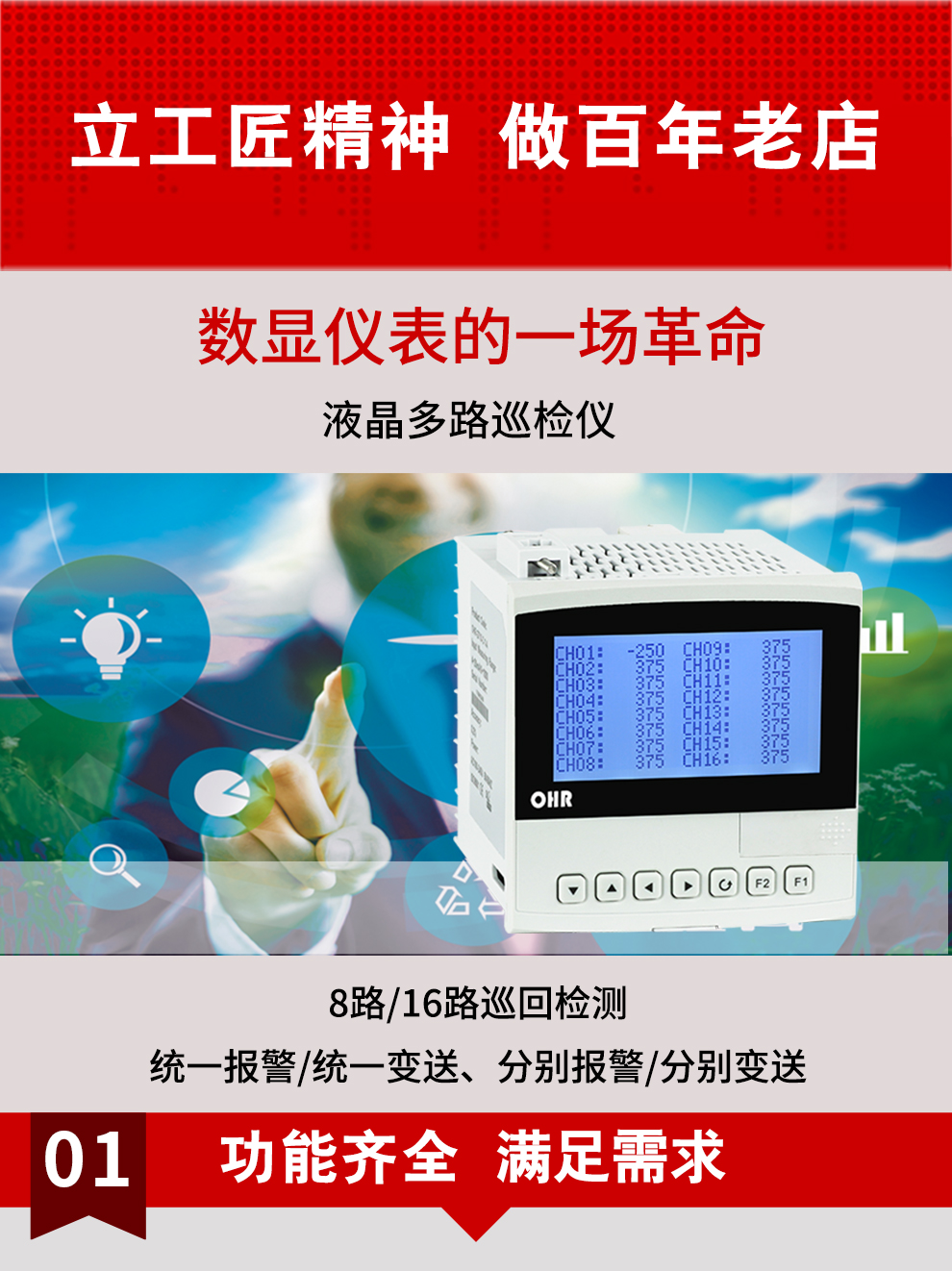 虹潤公司是專業(yè)生產(chǎn)多路溫度巡檢儀的國家專精特新“小巨人”企業(yè),生產(chǎn)的液晶多路巡檢儀,具有8路/16路測量通道,全切換信號輸入,統(tǒng)一報警統(tǒng)一變送輸出,分別報警分別變送輸出,RS485/RS232通訊等特點(diǎn)。產(chǎn)品獲得巡回檢測顯示方法及裝置、儀表殼體等2項(xiàng)國家發(fā)明專利,主持起草工業(yè)過程控制系統(tǒng)用模擬輸入兩位或多位輸出儀表、物聯(lián)網(wǎng)智能溫度儀表通用技術(shù)條件等2項(xiàng)國家標(biāo)準(zhǔn),以及通信系統(tǒng)多通道數(shù)據(jù)采集控制終端規(guī)范軍用標(biāo)準(zhǔn),參與國際5G標(biāo)準(zhǔn)制定,取得液晶多回路測量顯示控制儀等4項(xiàng)相關(guān)軟件著作權(quán)。產(chǎn)品廣泛應(yīng)用于電力、石化、冶金、制藥、水處理、機(jī)械配套等各種工業(yè)現(xiàn)場。