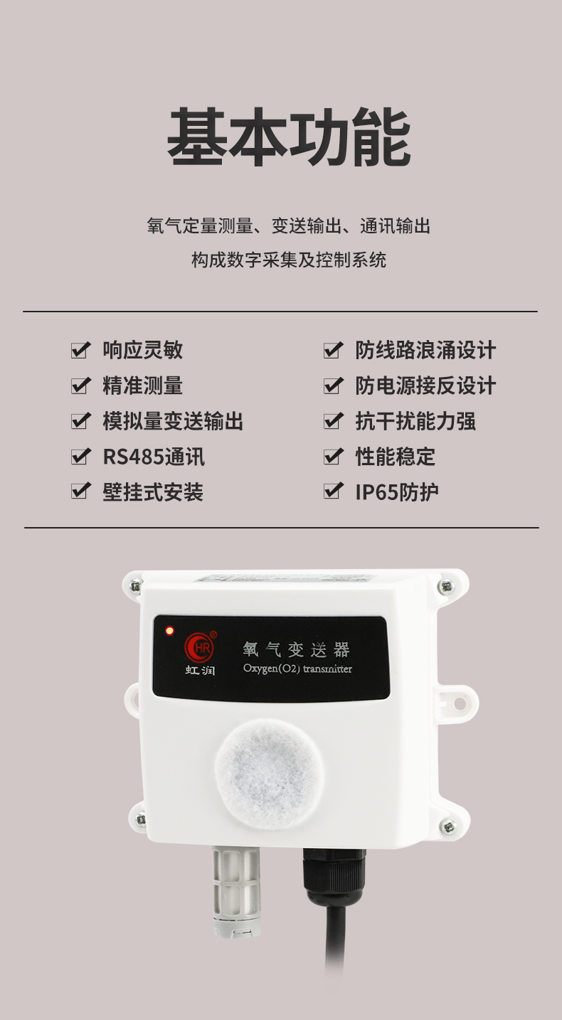 虹潤公司是專業生產環境監測儀表的國家專精特新“小巨人”企業。生產的氧氣變送器,具有采用電化學原理,響應靈敏,準確度高,低功耗,模擬量變送輸出或RS485通訊等特點。產品獲得一種農業監控變送器、一種儀表電源等2項實用新型專利,主持起草現場設備集成等5項智能制造國家標準,以及現場設備工具(FDT)接口規范、物聯網總體技術智能傳感器特性與分類等2項國家標準,參與國際5G標準制定,取得農業監控變送器等3項相關軟件著作權。產品廣泛應用于機房、配電站、地下車庫、工廠倉庫、食品儲存、養殖場、果蔬林園等環境場合對氧氣濃度的檢測。